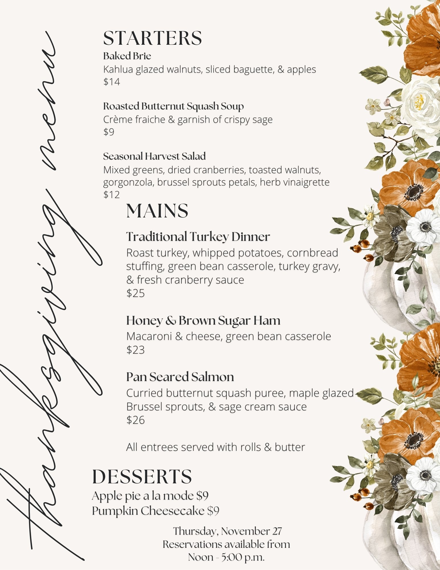 Reservations available from Noon - 5:00 p.m.